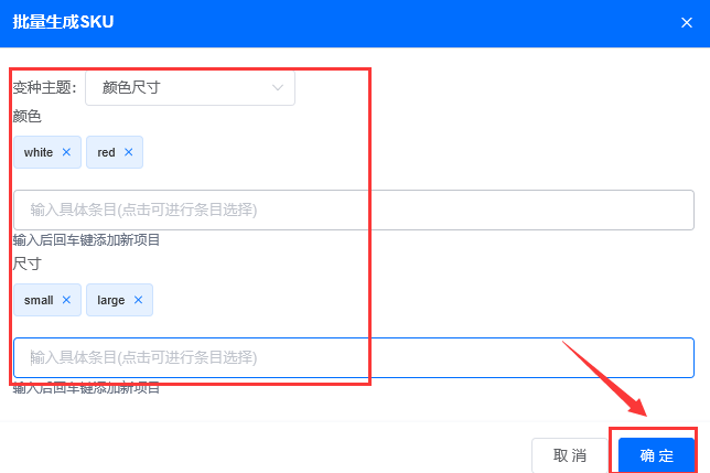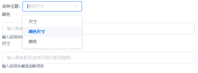 选择变体主题,一组变体或者两组变体,并填写具体条目(这里的主题只决定是一组还是两组变体,具体条目变体名称可以按照实际填写,尺寸要写全称,不能写S,M,L)