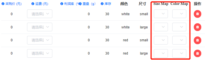 前面部分和没有变体填写规则一样,size map和color map可不填,也可以按照实际选择