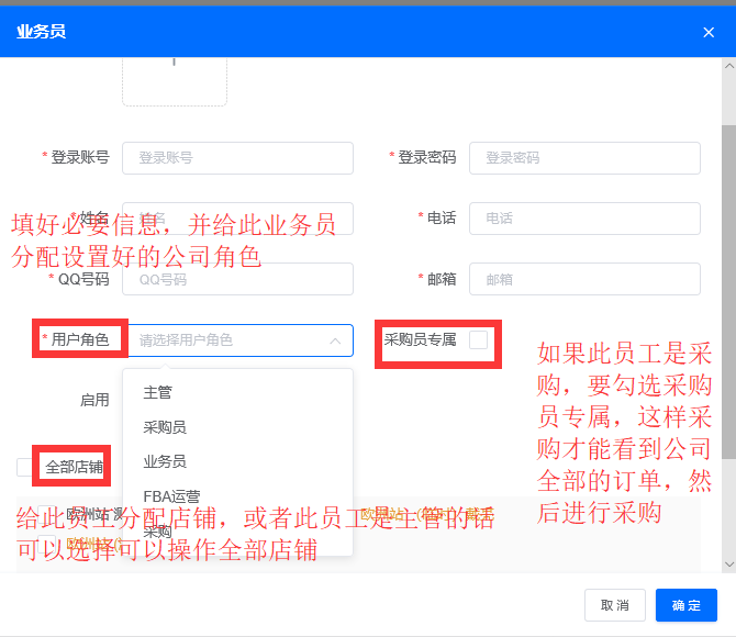 3.完成必要信息填写,给业务员分配角色,分配店铺(只能设置一个采购员专属账号),修改完以后点确定