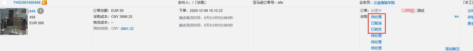 处理中:已经采购,等待仓库处理(状态不可手动更改)