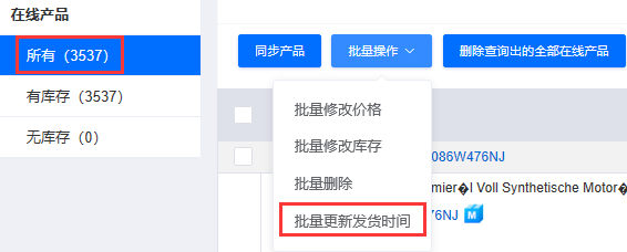 b.在线产品更新备货时间,可以通过筛选框或者选择框检索出需要更改备货时间的产品,点击批量更新发货时间