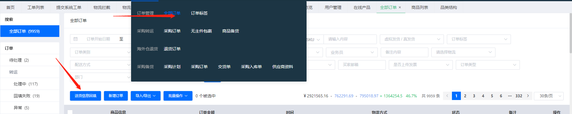 一、在全部订单中点击送货信息回填