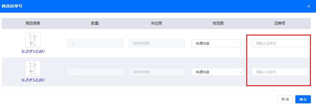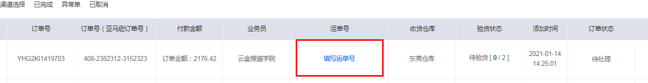 添加采购单后,可在此处直接填写物流单号,或者在采购页面添加
