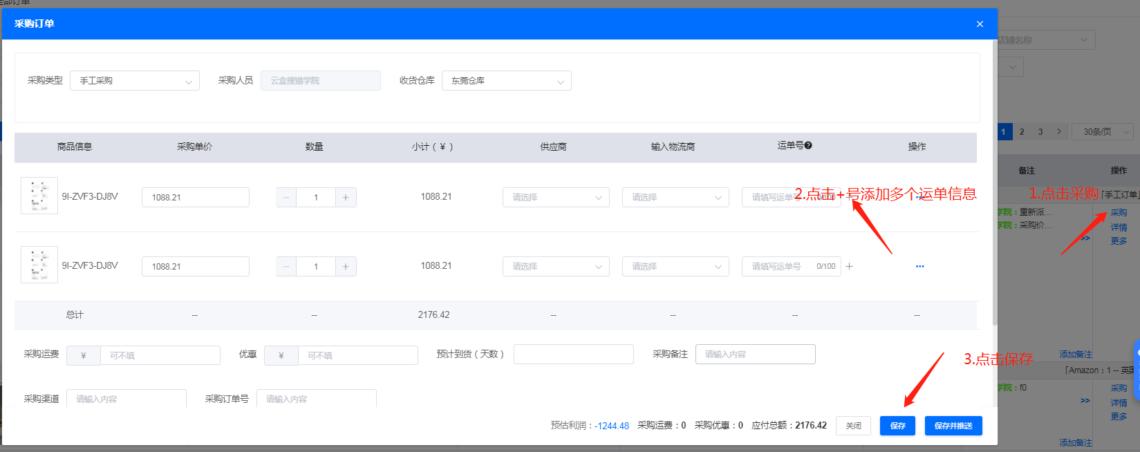 添加采购单时,多个订单的采购里的物流号都填写相同的,推送到仓库即可