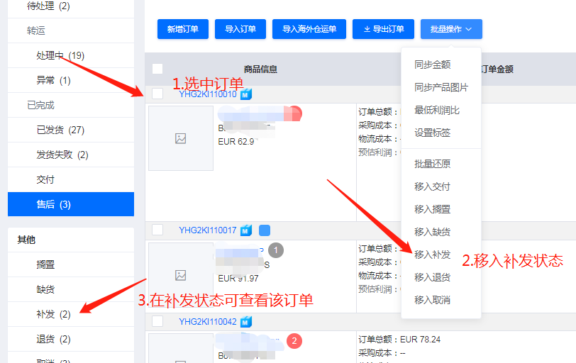 1.将订单移入补发