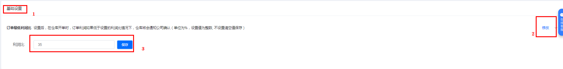 “基础设置”下的订单利润比一栏,点击右侧“修改”,填写完成之后点击“保存”
