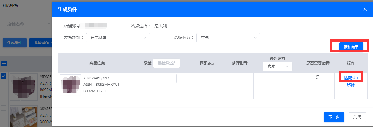 七、填写需要发货的数量,然后匹配sku(这个匹配sku的操作就是匹配仓库之前入库上架的这批货物,可以选择全部发送,也可以填写需要出库的数量),点击下一步