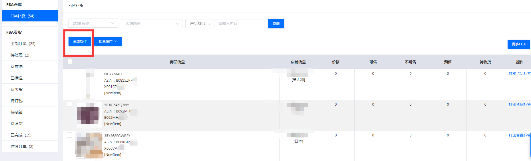 六、同步后,在fba仓库,找到要发货的产品,点击生成货件,如下图所示,如果有多个产品的话,可以勾选