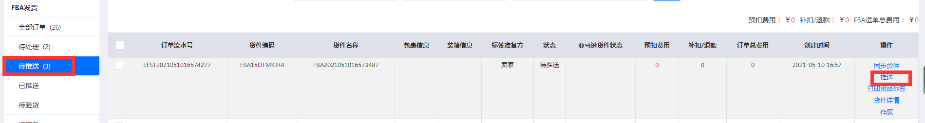 八、在待推送里面找到这个货件,推送到仓库,打印标签不用操作,仓库那边可以打印