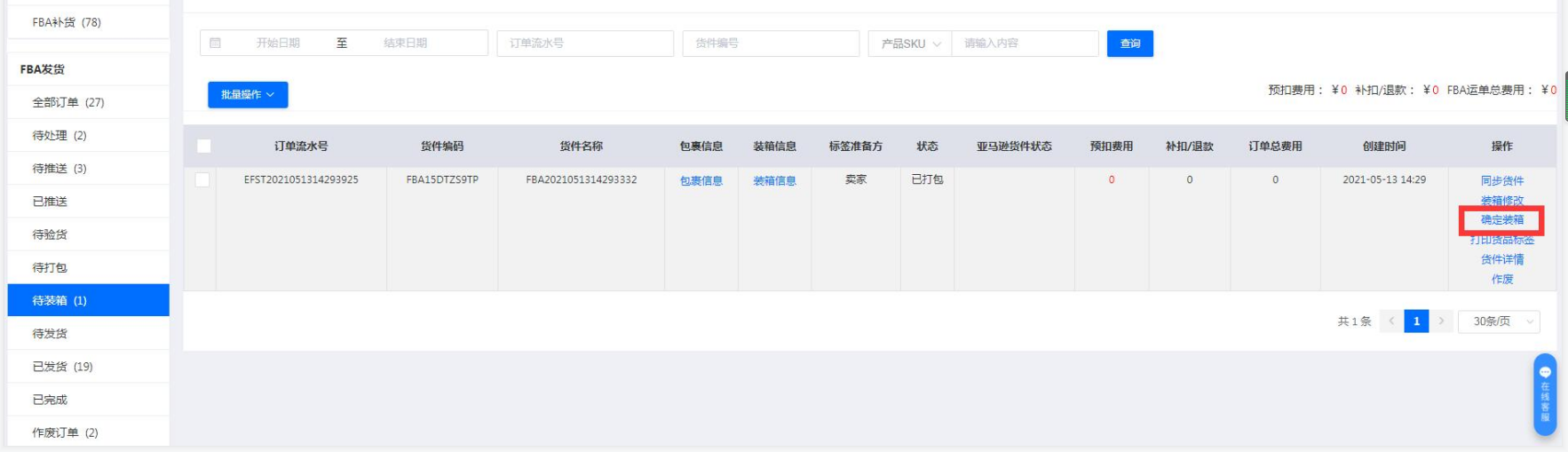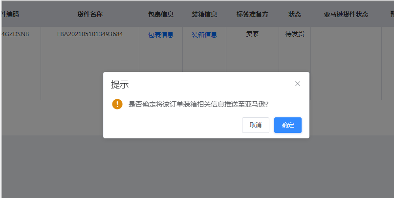 十、填完后会出来确认装箱按钮,确认没问题之后,点击确认装箱,把装箱相关信息同步至亚马逊,点确定