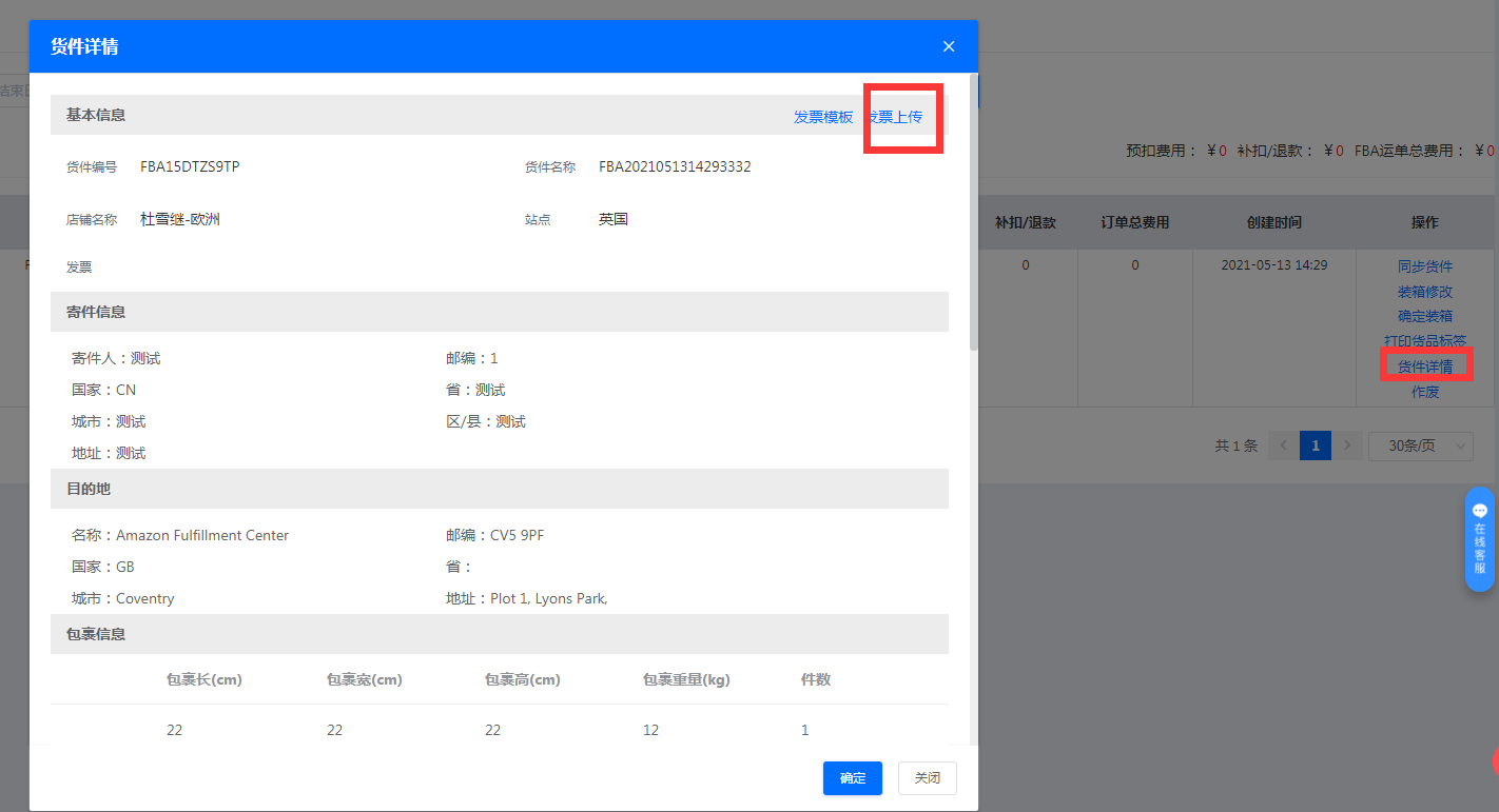 十一、回来点击货件详情,会出现下载发票和上传发票的地方,发票填完以后,上传,完成货件