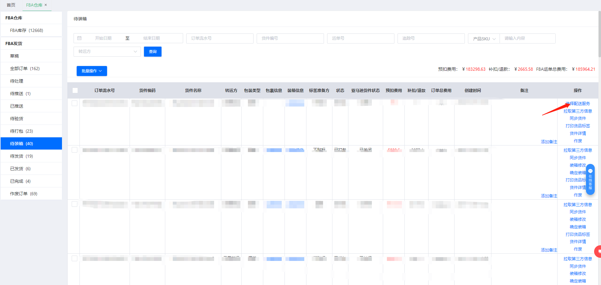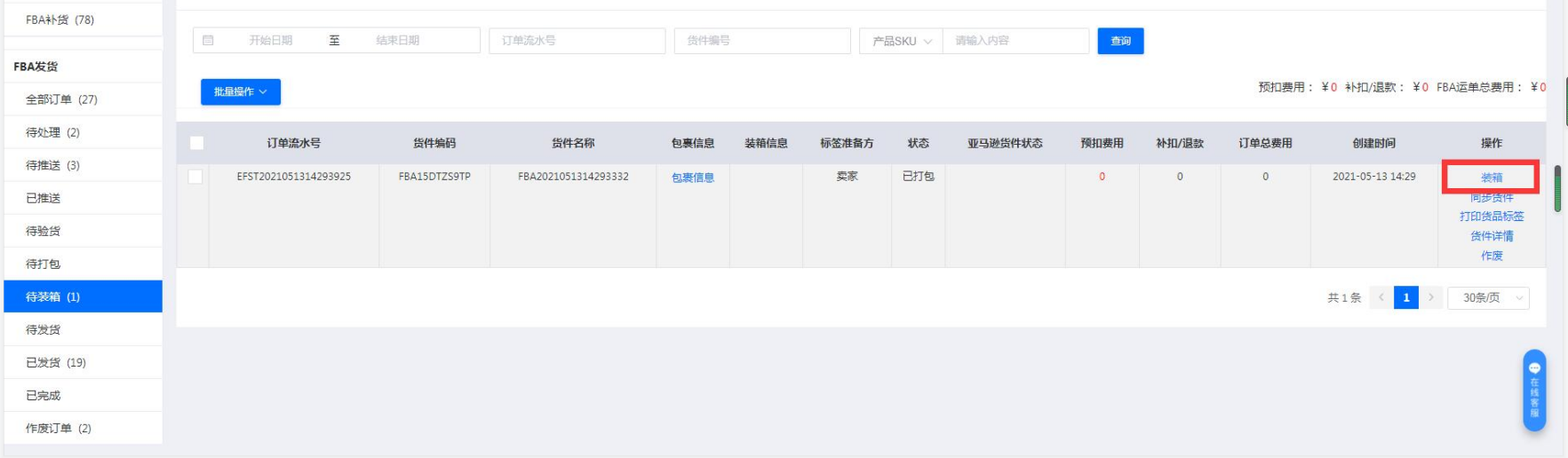 九、配送服务选好后,根据蓝色字样包裹信息,点击装箱,填写装箱信息