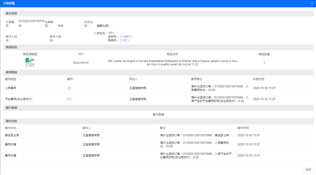 点击 详情 可查看 订单基本信息、商品信息、费用明细、图片数据、操作进度