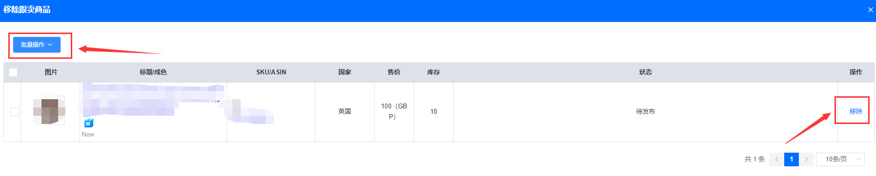 如果不想跟卖这个产品,也可以点击右边操作的“移除”按钮进行移除,如果定时跟卖的产品较多,也可以点击左上角的“批量操作”按钮,批量移除