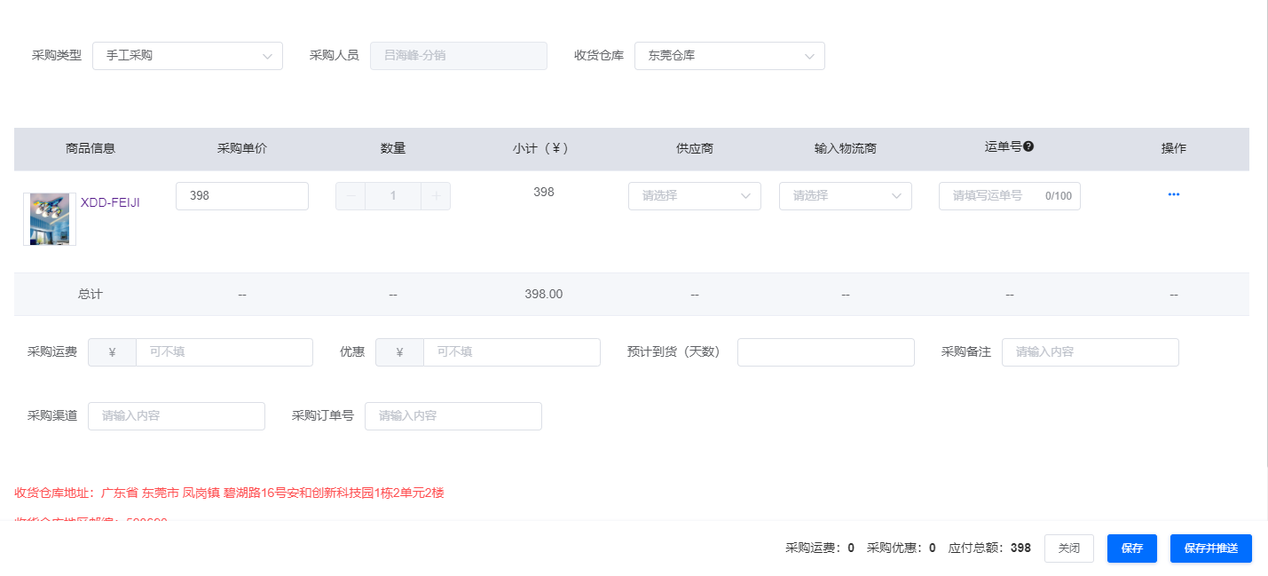 2:转运:如果自己采购产品发到东莞仓库,由东莞仓库代发的订单可点击“转运”按钮,填入相应的订单信息后点击“保存并推送”即可,如下图