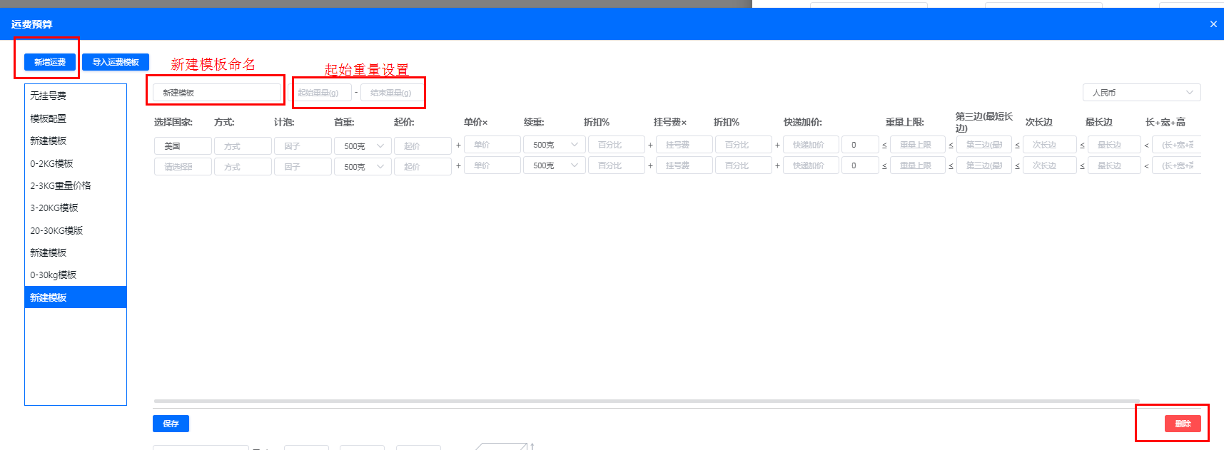 方式一:点击“新增运费”填写设置(可参考物流报价表),不使用或填写错误可点击“删除”
