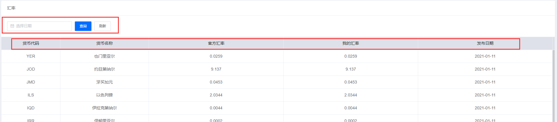 有各个国家汇率的发布日期和货币名称代码,左上角也可选择日期查询当天的汇率