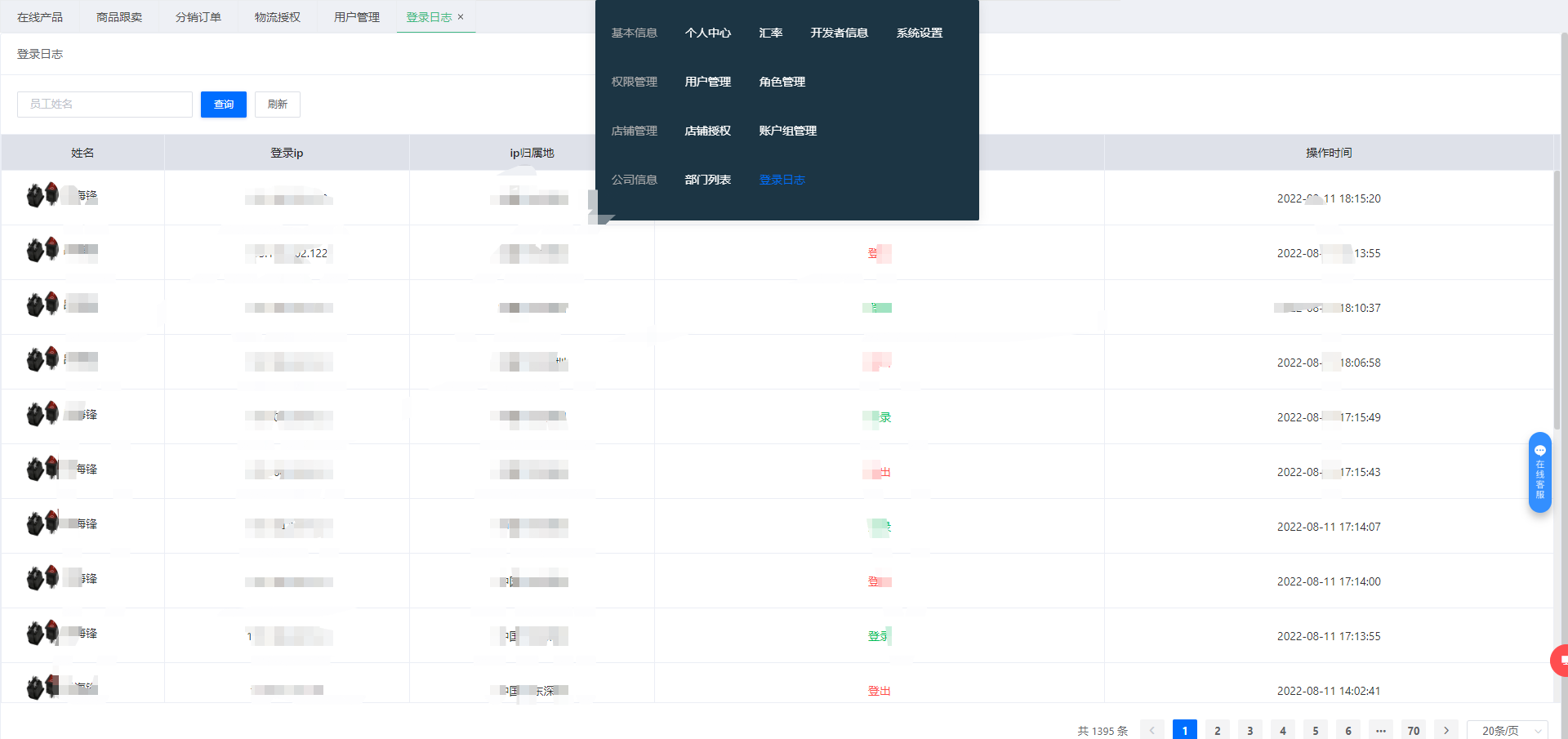 员工登录日志可以看到每个帐号的登录的IP 地址 行为和操作时间,可以有效跟踪帐号,提高账号的安全性