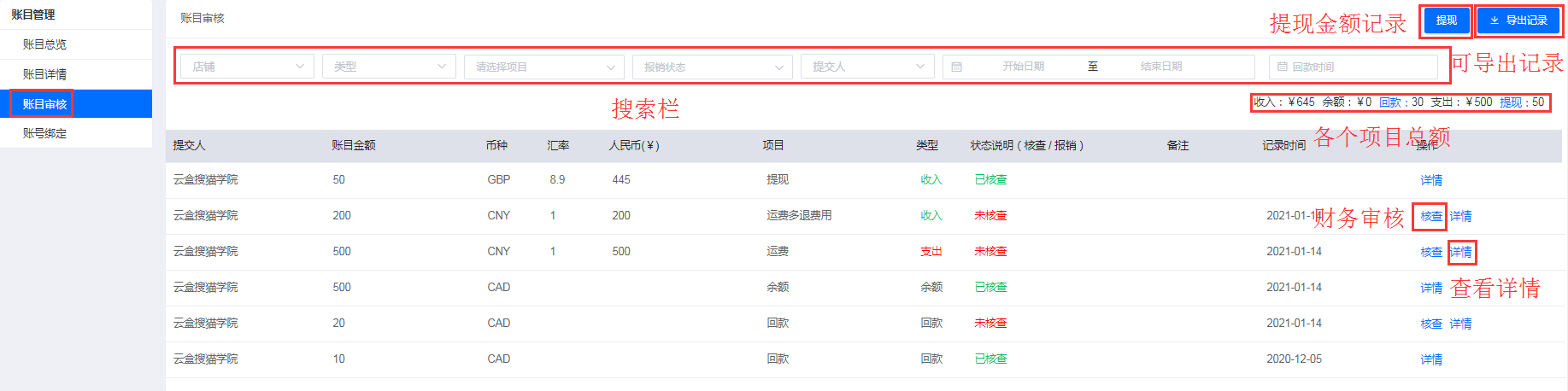 11.可以统计公司所有账户 汇款和余额,并与账户绑定,方便查询