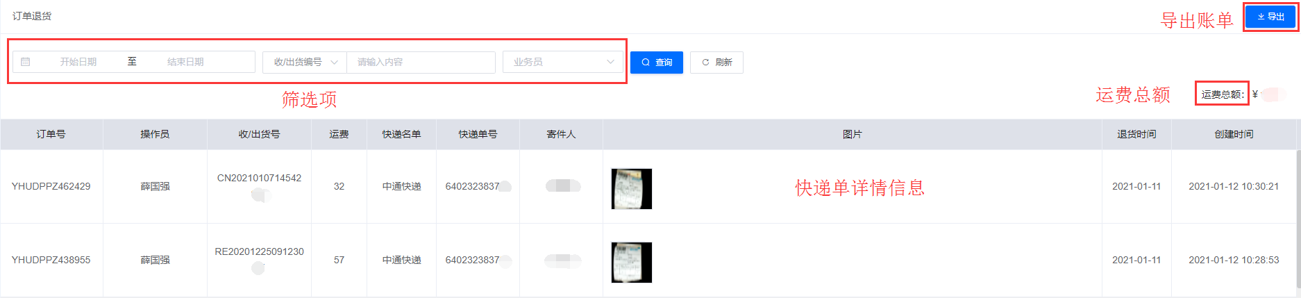2.可按照日期,收/出货编号、订单号,业务员 筛选条件查看订单退货详细信息