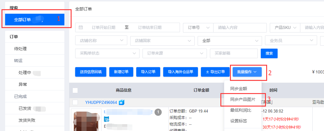 如果接收的订单图片没有更新出来,可以去订单页面选中图片未更新出来的订单,点击批量操作下面的同步产品图片,如下图