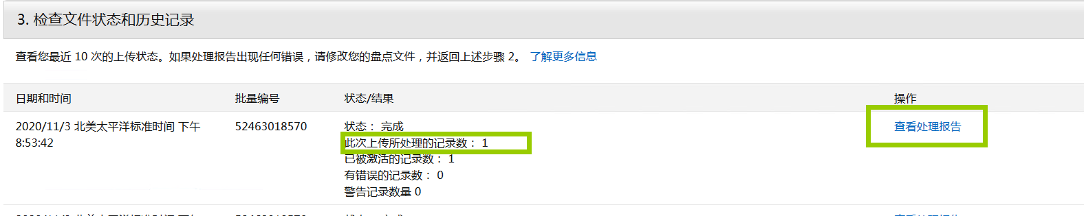 模板上传以后,一般3-5分钟以后,点击一下refresh按钮,就能看到系统处理的结果。如果填写的内容有问题,点击右侧的 view processing report,下载处理报告,根据里面列出的问题对模板进行更改再次上传即可。
